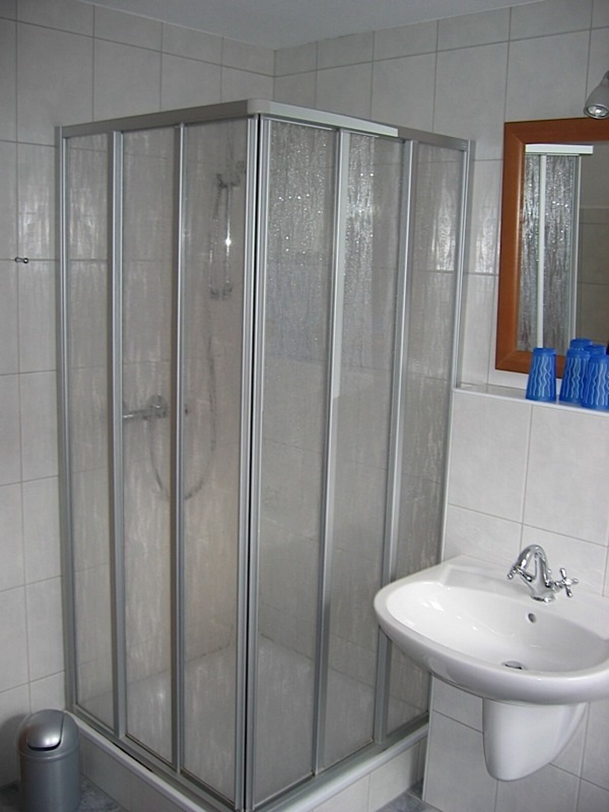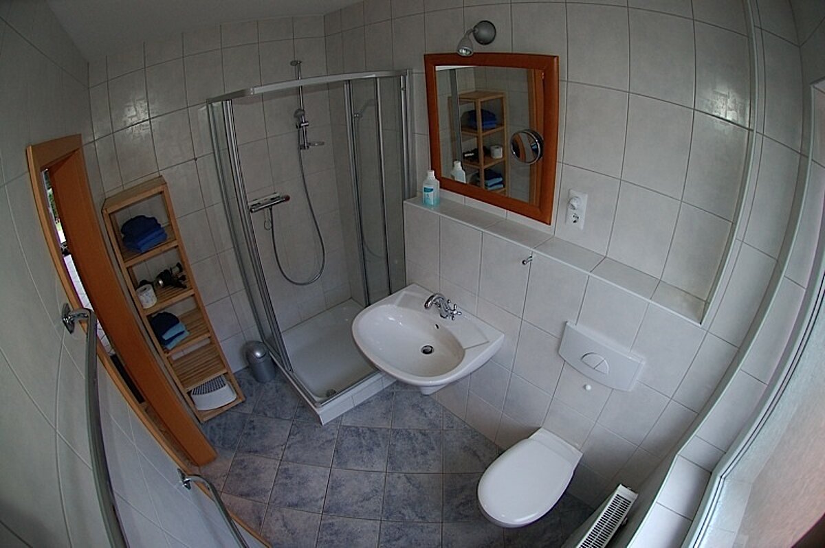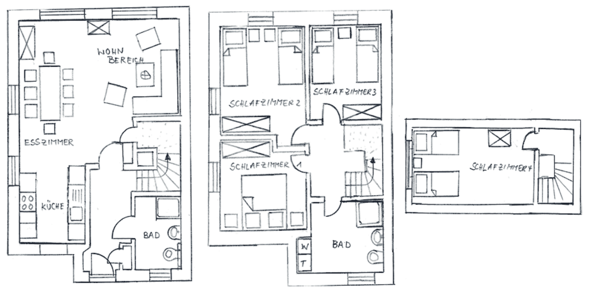 Im Obergeschoss sind 3 Schlafzimmer mit komfortablen Betten. Ein Zimmer ist mit einem Doppelbett, die anderen beiden sind mit jeweils zwei Einzelbetten ausgestattet. Zwei Zimmer haben einen Fernseher. Für die kleinen Gäste gibt es zwei Kinderbetten sowie eine Wickelmöglichkeit. Auch auf diesem Stockwerk ist ein Bad mit Dusche und WC. Zusätzlich steht ihnen hier eine Waschmaschine und ein Trockner zur Verfügung.